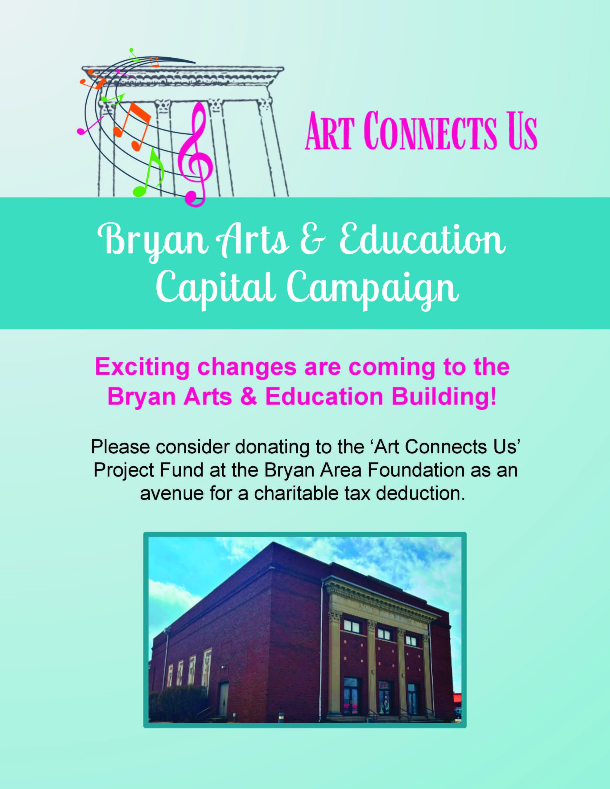 The ART Connects Us Project will address the removal and remediation of the former classrooms and gymnasium, will add a much-needed fellowship space, accessible restroom facilities, and will bring the performing arts technology up to the twenty-first century. Bryan native, community member, and arts advocate Russ Davies leads the ART Connects Us capital campaign and notes that the value of the arts in our community goes well beyond self-expression and enjoyment. A strong arts culture, especially the facilities to support it, creates shared experiences and has a social and generational impact. As the current President of Bryan Development, Russ also notes the project’s role in the continued momentum and revitalization in downtown Bryan.