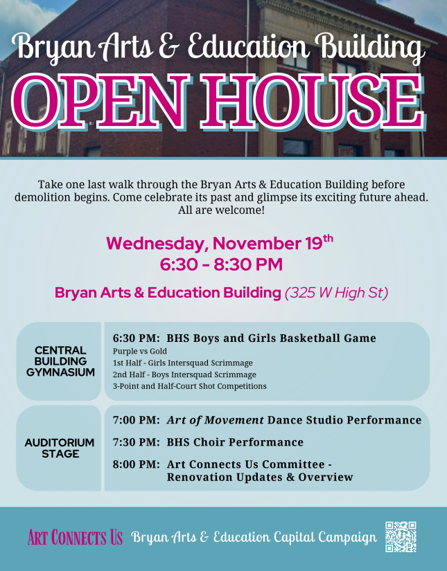 In November of 2024, the Bryan Area Foundation Trustees approved the establishment of a new project fund to support the fundraising efforts of a new collaborative community undertaking to benefit the performing arts in Bryan, Ohio. Established by Bryan City Schools with a $100,000 donation pledged by community members Dr. George and Julie Brown, the ART Connects Us Project Fund will be used to revitalize the historic Arts and Education Center building at 325 W. High Street. This property was the original site of Bryan High School, which opened in 1903. In 1917, the auditorium and gymnasium were added.