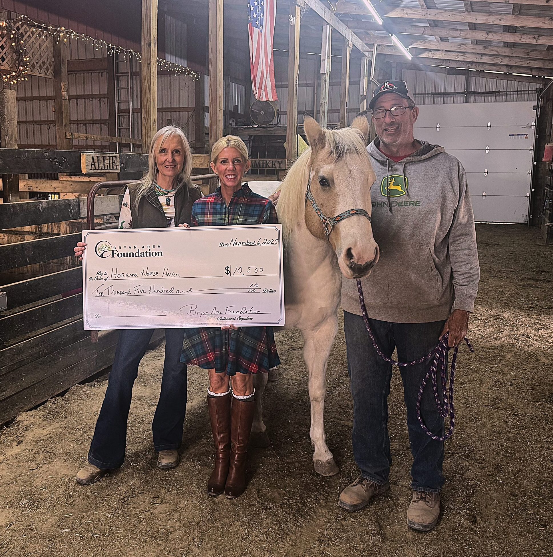 Pictured left to right during the check presentation are Hosanna Horse Haven Director Lisa Allomong, Bryan Area Foundation President/CEO Amy Miller, rescued and therapy quarter horse Nellie, and Hosanna Horse Haven President Will Allomong.