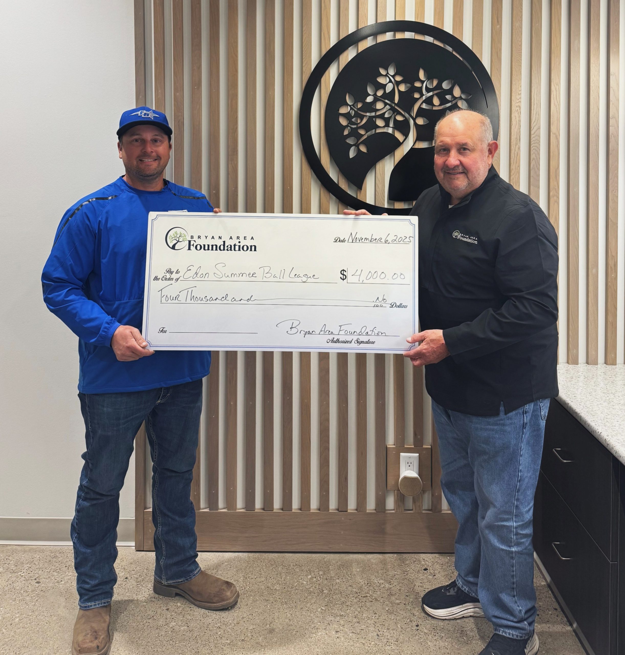 Pictured left to right during the check presentation are Edon Summer Ball League President Chad Livensparger and Bryan Area Foundation Grant Making Committee Chair Mark Miller.